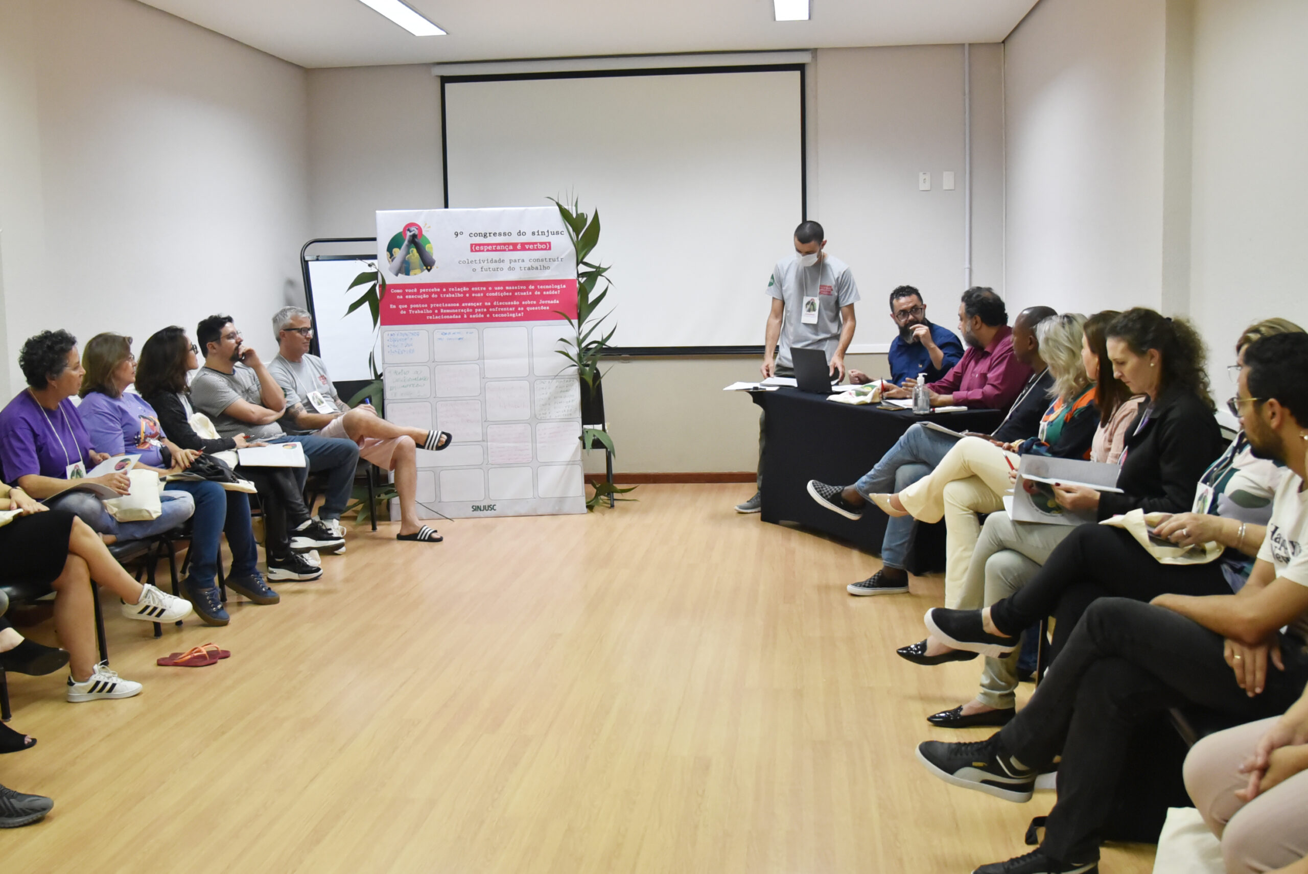 No primeiro dia do evento, que aconteceu entre quinta-feira e sábado (26 e 28 de maio), em Florianópolis, foi realizada uma mesa de debate que abordou a construção da esperança pelo futuro. Na sexta-feira (27), aconteceram duas mesas, uma que debateu a organização sindical e a necessidade de união da categoria, e a outra abordou temas ligados à saúde mental do trabalhador.