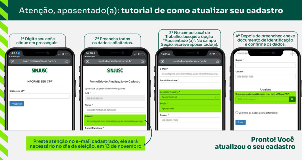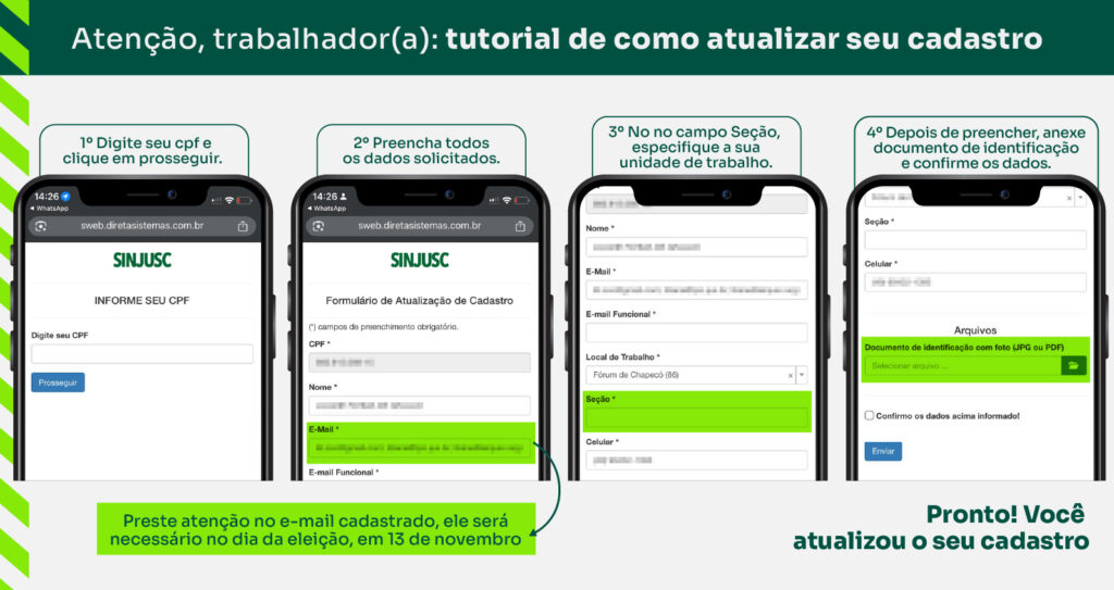 2. A atualização do seu número de telefone e local de trabalho facilita a sua localização pelo Sindicato no caso de uma ação ou orientação jurídica por parte da assessoria do SINJUSC;