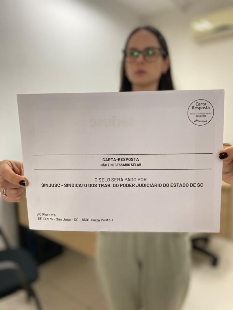 E. Envie o envelope branco, que tem o seu nome e endereço como remetente, já está selado e endereçado para a caixa postal do SINJUSC, pela agência dos Correios mais próxima, o mais breve possível.
