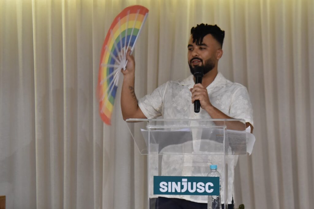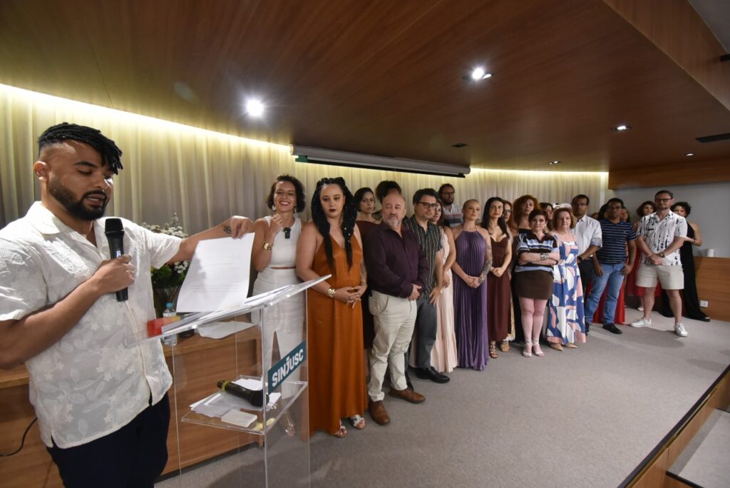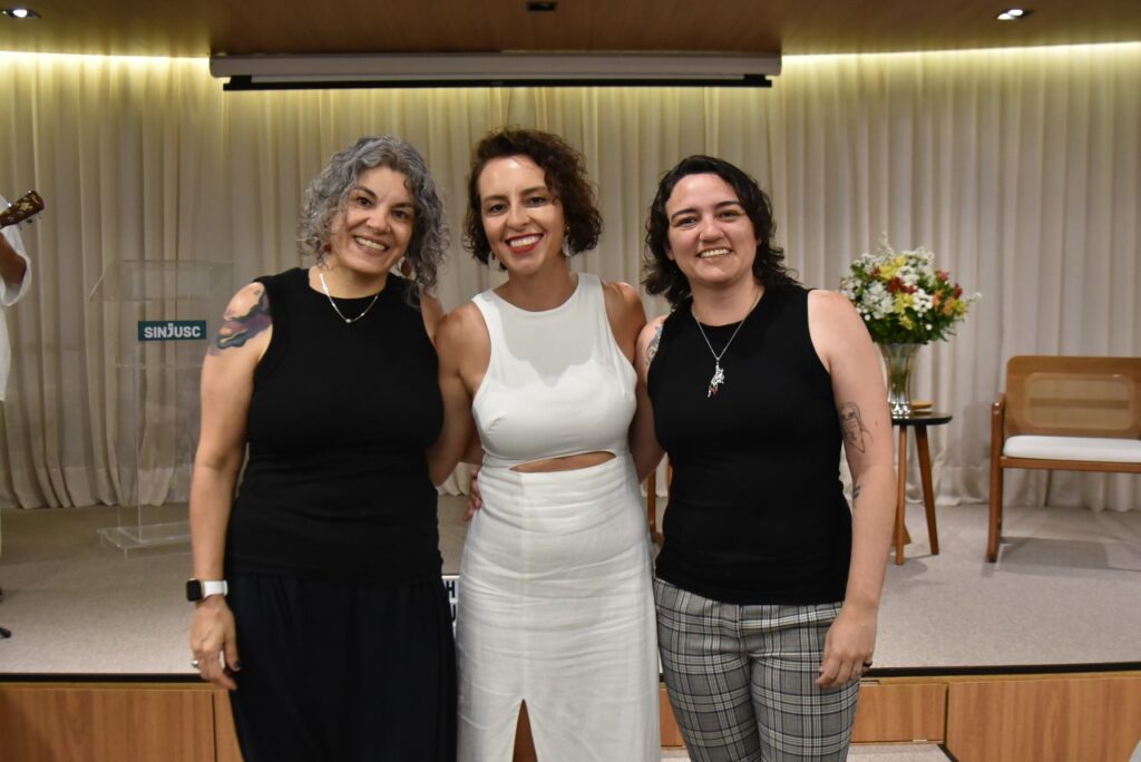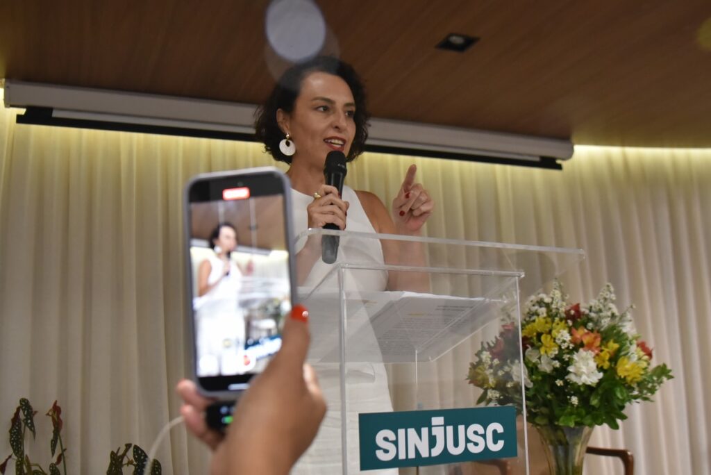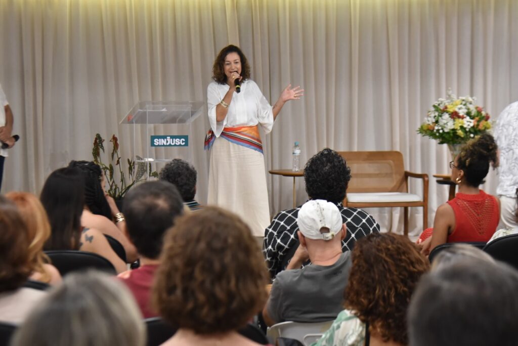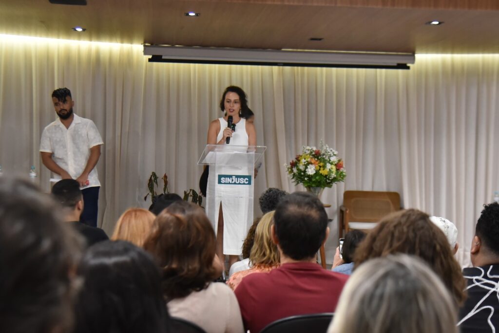 A presidenta reeleita do SINJUSC, Carolina Rodrigues Costa, foi mencionada com frequência no discurso de convidadas e convidados que constataram a necessidade de mais sindicatos dirigidos por um grupo tão plural quanto a direção reeleita do SINJUSC. Muitas intervenções indicaram a necessidade de diversidade nas direções sindicais como um caminho para entender melhor os principais problemas vividos pela classe trabalhadora e no desenvolvimento de práticas e discursos capazes de atraí-la para a organização e a luta.