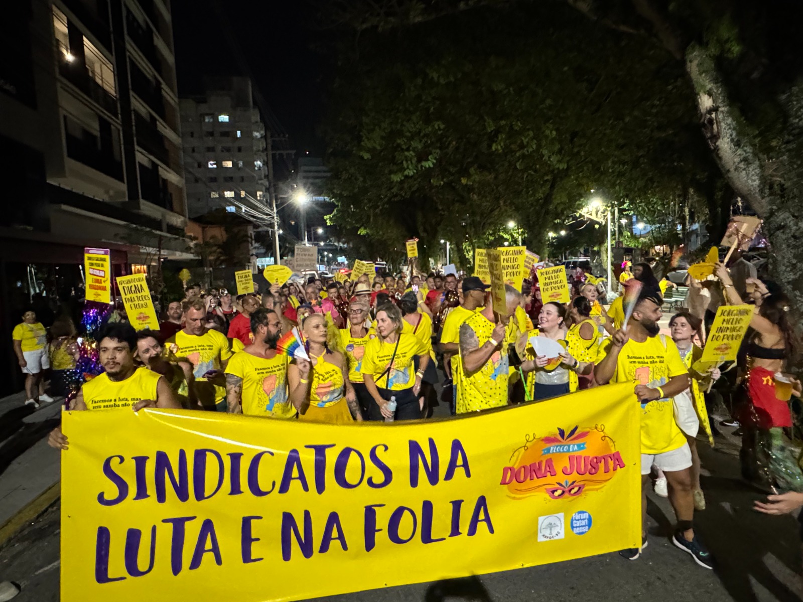 No cortejo do Dona Justa, além dos “pirulitos” com mensagens que denunciavam o governador do Estado, trabalhadoras e trabalhadores dos serviços públicos de Santa Catarina carregaram faixas em defesa de uma aposentadoria digna e conclamando todas as organizações sindicais e de classe para a luta, inclusive no carnaval!