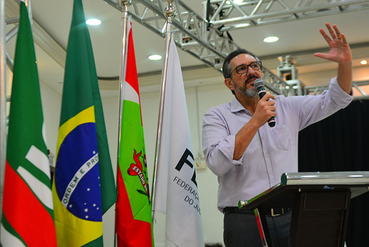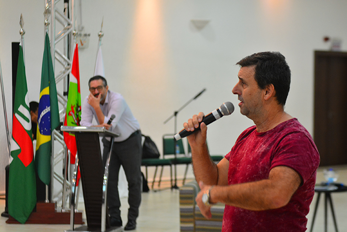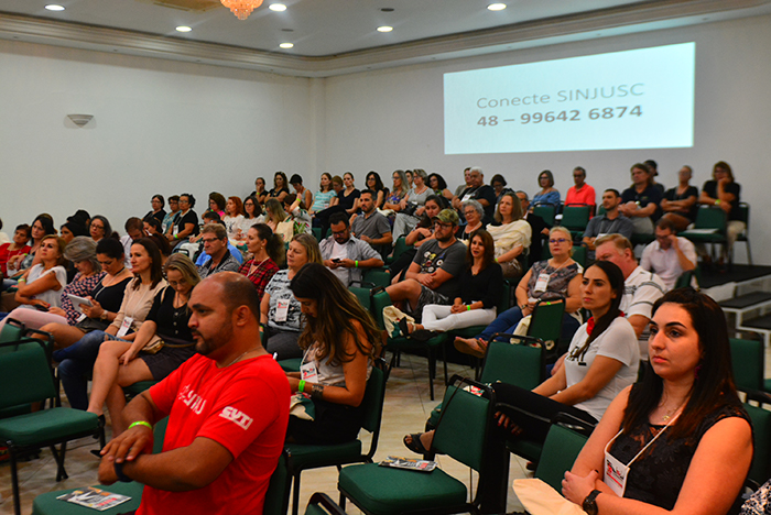 O final do percurso de debates do 8º Congresso dos trabalhadores e trabalhadoras do judiciário catarinense teve como palestrantes o membro do Conselho Nacional de Justiça e juiz do Tribunal Regional do Trabalho da 10ª Região Luciano Frota e Volnei Rosalen, oficial de justiça, ex-presidente do SINJUSC e professor da UFSC. Na ocasião foi abordado o tema “Judiciário brasileiro no século 21”.