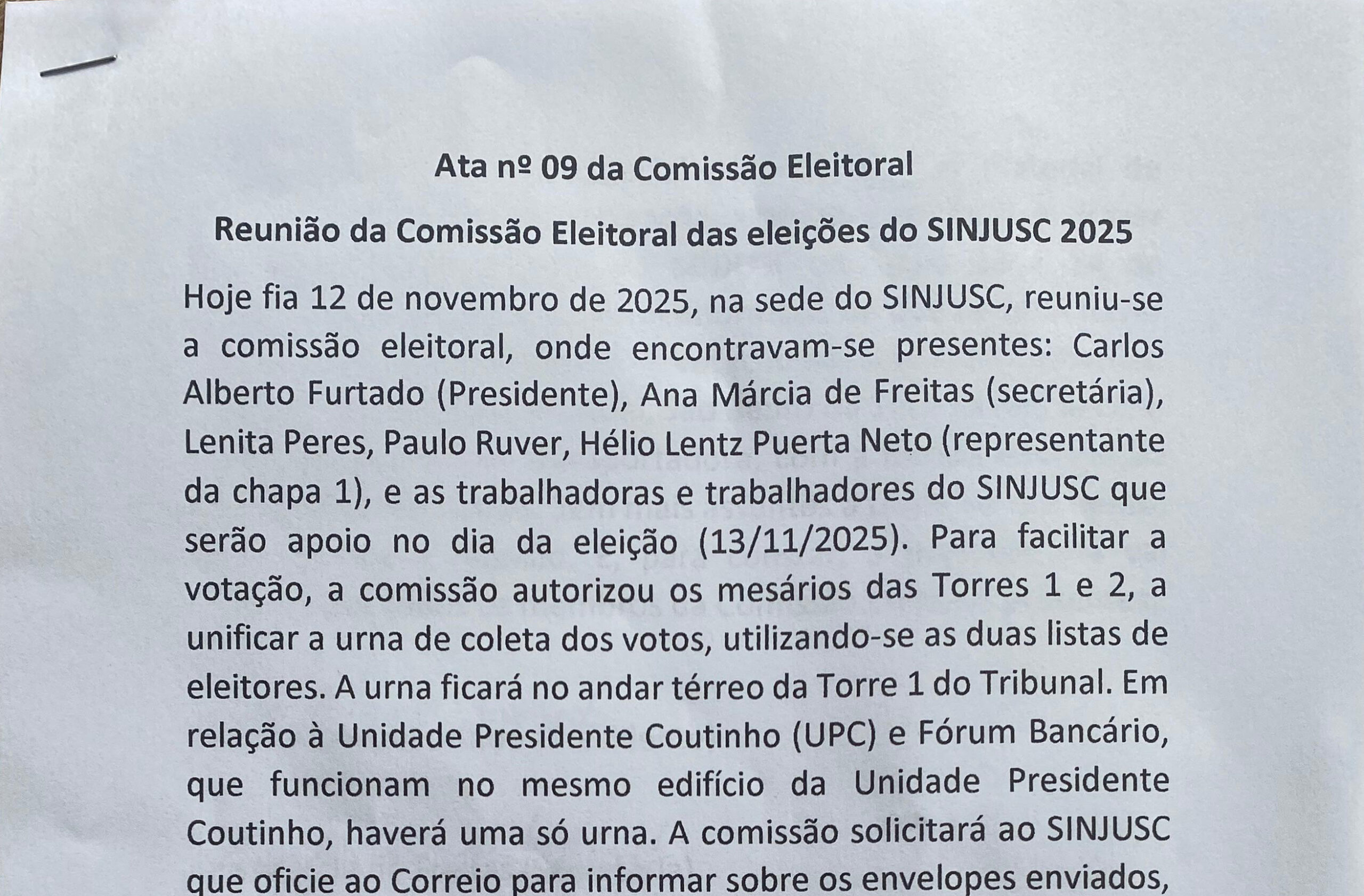 Hoje dia 12 de novembro de 2025, na sede do SINJUSC, reuniu-se a comissão eleitoral, onde encontravam-se presentes: Carlos Alberto Furtado (Presidente), Ana Márcia de Freitas (secretária), Lenita Peres, Paulo Ruver, Hélio Lentz Puerta Neto (representante da chapa 1), e as trabalhadoras e trabalhadores do SINJUSC que serão apoio no dia da eleição (13/11/2025). Para facilitar a votação, a comissão autorizou os mesários das Torres 1 e 2, a unificar a urna de coleta dos votos, utilizando-se as duas listas de eleitores. A urna ficará no andar térreo da Torre 1 do Tribunal. Em relação à Unidade Presidente Coutinho (UPC) e Fórum Bancário, que funcionam no mesmo edifício da Unidade Presidente Coutinho, haverá uma só urna. A comissão solicitará ao SINJUSC que oficie ao Correio para informar sobre os envelopes enviados, quantos foram devolvidos e quantos foram devidamente entregues. Sobre a logística no dia 13/11, dia do pleito, os carros do sindicato ficarão à disposição para recolhimento dos malotes, sendo às 16 horas saída do sindicato para recolhimento dos votos do correio que estão na caixa postal contratada para recebimento dos votos de aposentados e teletrabalho integral. E posteriormente, após o fim do prazo para votação que encerrará às 18h30 em todas as unidades, um carro fará a rota continente onde recolherá as urnas de Palhoça, São José e Fórum do Continente e outro carro irá fazer a seguinte rota na ilha: Norte da Ilha, UPC, UPR, Torre 1 e Torre 2, Fórum Central da Capital e o Fórum Eduardo Luz. Sobre os procedimentos do voto em separado, a comissão eleitoral informará aos mesários para que junto com a ata de apuração, envie a lista de votantes da comarca. Além disso, informará aos mesários sobre procedimento de identificação e vínculo dos filiados nos casos de voto em separado. Uma transportadora contratada pelo SINJUSC vai passar nas comarcas de Entrância Especial para recolher o material de votação após a devida apuração realizada no local e trazer diretamente para a sede do SINJUSC nos dias 13 e 14 de novembro. A Comissão Eleitoral informada de que poderia haver atraso na entrega do material de votação nas seguintes Comarcas: Anchieta, Lebon Régis, Mondaí, São Bento do Sul e Xaxim, decidiu enviar o material por transportadora, com a devida informação aos mesários dos locais. Sem mais assuntos a tratar no momento, foi encerrada a reunião. E, para constar, a presente ata vai assinada por todos os membros da Comissão Eleitoral presentes.