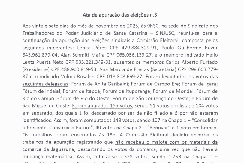 Aos vinte e sete dias do mês de novembro de 2025, às 9h30, na sede do Sindicato dos Trabalhadores do Poder Judiciário de Santa Catarina – SINJUSC, reuniu-se para a continuação da apuração das eleições sindicais a Comissão Eleitoral, composta pelos seguintes integrantes: Lenita Péres CPF 479.884.529-91, Paulo Guilherme Ruver 343.961.879-04, Alan Schmitt Mafra CPF 065.056.139-27, e o membro indicado Hélio Lentz Puerta Neto CPF 035.221.349-31, ausentes os membros Carlos Alberto Furtado (Presidente) CPF 488.900.819-53, Ana Márcia de Freitas (Secretária) CPF 298.603.779-87 e o indicado Volnei Rosalen CPF 018.808.669-27. Foram levantados os votos das seguintes delegacias: Fórum de Anita Garibaldi; Fórum de Campo Erê; Fórum de Içara; Fórum de Indaial; Fórum de Itapoá; Fórum de Ituporanga; Fórum de Mondai; Fórum de Rio do Campo; Fórum de Rio do Oeste; Fórum de São Lourenço do Oeste; e Fórum de São Miguel do Oeste. Foram apurados 155 votos, sendo 51 votos em lista; e 104 votos em separado, dos quais 1 foi descartado por ser de não filiado e 6 por não estarem identificados. Assim, foram computados 148 votos, sendo 107 na Chapa 1 – “Consolidar o Presente, Construir o Futuro”, 40 votos na Chapa 2 – “Renovar” e 1 voto em branco. Os trabalhos foram encerrados às 13h. A Comissão Eleitoral decidiu encerrar os trabalhos de apuração registrando que não recebeu o malote com os materiais da comarca de Jaguaruna, descartando os votos da comarca, uma vez que não haverá mudança matemática. Assim, totaliza-se 2.528 votos, sendo 1.753 na Chapa 1 – “Consolidar o Presente, Construir o Futuro”, 760 votos na Chapa 2 – “Renovar”, 8 votos em branco, 7 votos nulos, perfazendo uma diferença de 993 votos válidos. Registra-se, para fins estatísticos, que eram aptos a votar 4.360 filiados sindicalizados. A Comissão Eleitoral declara eleita a Chapa 1 – “Consolidar o Presente, Construir o Futuro” para o triênio 2025-2028, a ser iniciado em 17 de dezembro do corrente ano. Após, os materiais foram depositados em sala trancada e lacrada pela Comissão Eleitoral. Pelo adiantado da hora e pelo baixo quórum, foi adiada a análise dos pedidos nos ofícios da Chapa 2 para outra reunião, a se realizar na terça-feira, dia 2 de dezembro. E, nada mais havendo a tratar, foi encerrada a presente reunião. Assim, eu, Alan Schmitt Mafra, lavrei a presente ata, que vai assinada por todos os membros presentes ao final dos trabalhos.