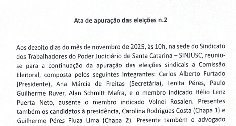 Aos dezoito dias do mês de novembro de 2025, às 10h, na sede do Sindicato dos Trabalhadores do Poder Judiciário de Santa Catarina – SINJUSC, reuniu-se para a continuação da apuração das eleições sindicais a Comissão Eleitoral, composta pelos seguintes integrantes: Carlos Alberto Furtado (Presidente), Ana Márcia de Freitas (Secretária), Lenita Péres, Paulo Guilherme Ruver, Alan Schmitt Mafra, e o membro indicado Hélio Lenz Puerta Neto, ausente o membro indicado Volnei Rosalen. Presentes também os candidatos à presidência, Carolina Rodrigues Costa (Chapa 1) e Guilherme Péres Fiuza Lima (Chapa 2). Presente também o advogado Fabrizio Rizzon, OAB/SC 19.111-A. Foram levantados os votos das seguintes delegacias: Capital – Norte da Ilha; Fórum de Herval D’Oeste; Fórum de Lages; Fórum de Meleiro. Pendentes de totalização as delegacias: Fórum de Anita Garibaldi; Fórum de Campo Erê; Fórum de Içara; Fórum de Indaial; Fórum de Itapoá; Fórum de Ituporanga; Fórum de Jaguaruna; Fórum de Mondai; Fórum de Rio do Campo; Fórum de Rio do Oeste; Fórum de São Lourenço do Oeste; e Fórum de São Miguel do Oeste. Foram apurados 289 votos, sendo 52 votos em lista; 200 votos em separado, dos quais 2 foram descartados por serem de não filiados e 3 por não estarem identificados; e 37 votos enviados pelos correios, dos quais 1 foi descartado por duplicidade. Assim, foram computados 283 votos, sendo 172 na Chapa 1 – “Consolidar o Presente, Construir o Futuro”, 110 votos na Chapa 2 – “Renovar” e 1 voto em branco. Os trabalhos foram suspensos à 18h40. Sete votos em separado equivocadamente não foram descartados por duplicidade, pois já tinham sido computados em votos pelos correios. Considerando que foram apurados até o momento 2.380 votos, sendo 1.646 na Chapa 1 – “Consolidar o Presente, Construir o Futuro”, 720 votos na Chapa 2 – “Renovar”, 7 votos em branco, 7 votos nulos, perfazendo uma diferença de 926 votos válidos, e considerando também que há a apurar 91 votos em separado, mais um máximo possível de 83 votos das delegacias sindicais pendentes de totalização, e que não haverá mais recolhimento de votos pelos correios por estar encerrado o prazo estipulado pela Comissão Eleitoral, a Comissão Eleitoral declara matematicamente eleita a Chapa 1 – “Consolidar o Presente, Construir o Futuro”, sem prejuízo da totalização dos votos restantes, que será continuada dia 27 de novembro às 9h30. Registra-se que às 12h o representante da Chapa 2 – “Renovar” se ausentou, sem regresso. Após, os materiais já apurados e os pendentes de apuração foram depositados em sala trancada e lacrada pela Comissão Eleitoral. E, nada mais havendo a tratar, foi encerrada a presente reunião. Assim, eu, Alan Schmitt Mafra, lavrei a presente ata, que vai assinada por todos os membros presentes ao final dos trabalhos.