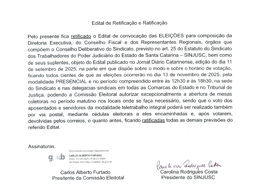 Pelo presente fica retificado o Edital de convocação das ELEIÇÕES para composição da Diretoria Executiva, do Conselho Fiscal e dos Representantes Regionais, órgãos que compõem o Conselho Deliberativo do Sindicato, previsto no art. 25 do Estatuto do Sindicato dos Trabalhadores do Poder Judiciário do Estado de Santa Catarina – SINJUSC, bem como de seus suplentes, objeto do Edital publicado no Jornal Diário Catarinense, edição do dia 11 de setembro de 2025, na parte em que dispõe sobre o modo e sobre o horário de votação, ficando todos cientes de que as eleições ocorrerão no dia 13 de novembro de 2025, pela modalidade PRESENCIAL e no período compreendido entre às 12h30 e às 18h30, na sede do Sindicato e nas delegacias sindicais em todas as Comarcas do Estado e no Tribunal de Justiça, podendo a Comissão Eleitoral autorizar excepcionalmente a abertura de mesas coletoras no período matutino nos locais onde se faça necessário, sendo que o voto dos aposentados e servidores da modalidade teletrabalho integral poderá ser realizado também por via postal, mediante cédulas eleitorais a eles encaminhadas e, após votarem, devolvidas pelos correios, o quanto antes, ficando ratificadas todas as demais previsões do referido Edital.