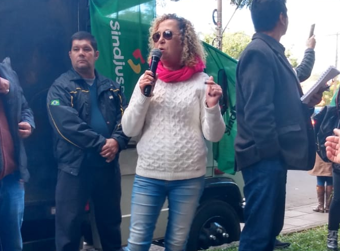 A vice-presidente do SINJUSC, Valfrida de Oliveira, participou do seminário e também do ato em frente ao TJRS onde se reuniram os Presidentes dos Tribunais, questionando “Que Justiça é essa?” que não atende reivindicações dos servidores, precariza o trabalho, extingue cargos, terceiriza sem limites, não recompõe o quadro de servidores por completo, contrata estagiários além do permitido, e dificulta o diálogo.