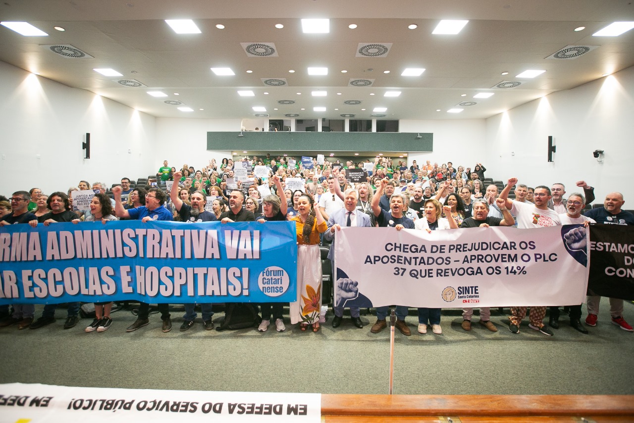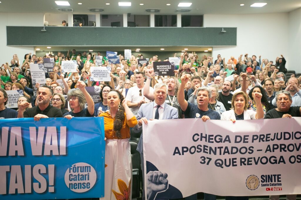 A manifestação também serviu como forma de pressionar parlamentares da Alesc a retomarem o andamento dos projetos que revogam o confisco de aposentadas e aposentados dos serviços públicos estaduais.