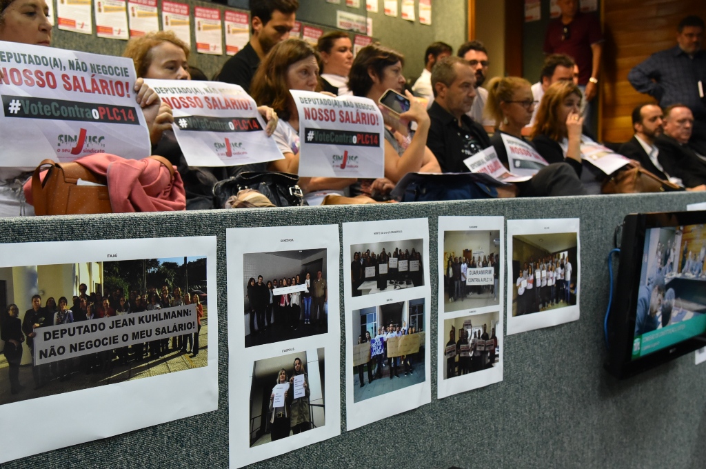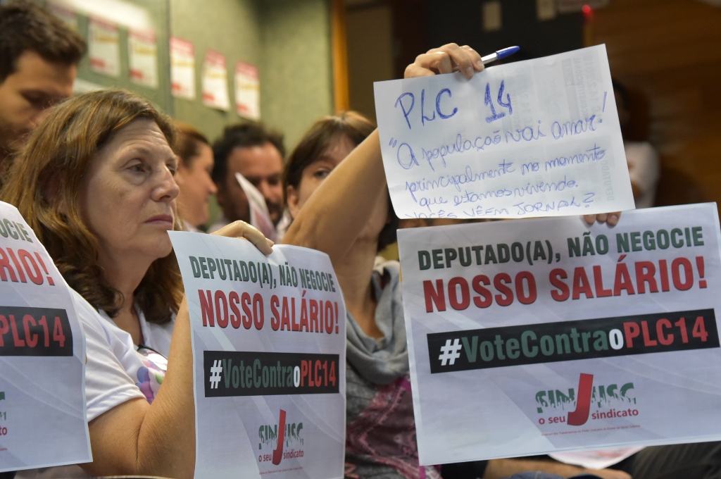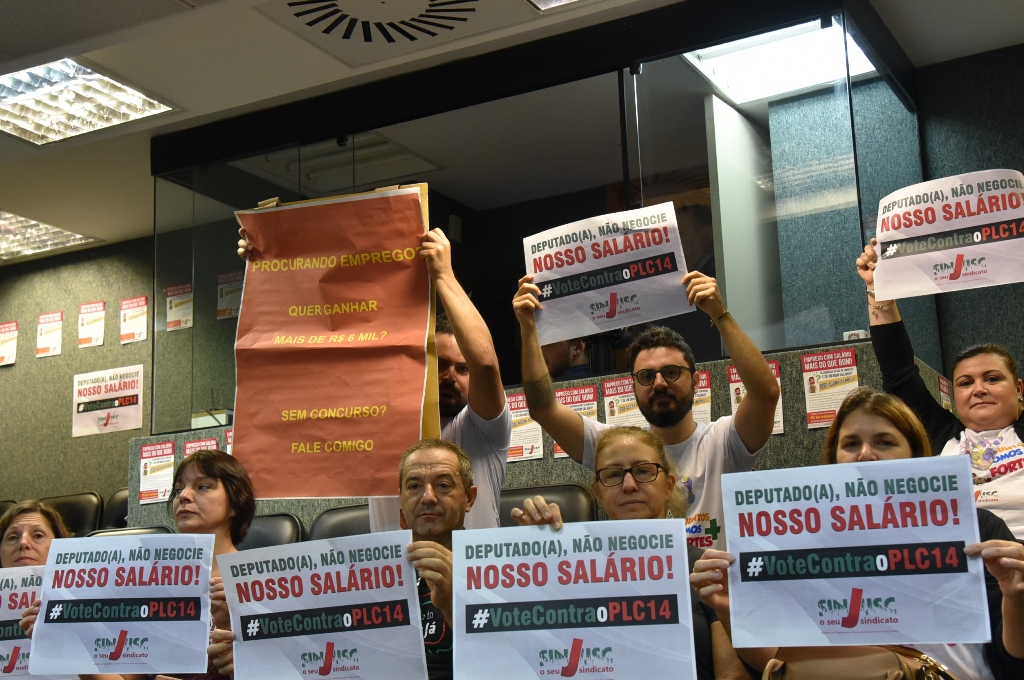 Após pressão da categoria, deputados recuam e não votam o PLC 14.2/2018. A mobilização dos trabalhadores na sessão de hoje (29.05) foi fundamental para segurar a votação por mais uma semana. A matéria volta ao debate na próxima terça-feira (05/06), a partir das 9h. O SINJUSC convoca os trabalhadores e trabalhadoras para comparecer na Alesc.